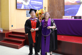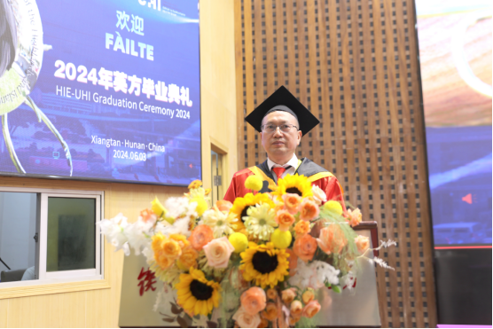 Veronica Lynch博士致辞。她热烈欢迎所有毕业生加入UHI校友大家庭,并欣喜地分享了UHI近年来荣获的新成就。她把两校的合作办学机制、家庭、社会比喻成一个紧密相连的生态系统,这个系统给予了青年学子精心的呵护和全力的支持,让他们从小树苗茁壮成长为参天大树。她希望毕业生们珍惜大学的土壤、家庭的华盖、产业的布局,向下扎根,向上生长,成为卓越的知识管家、思想传播者及工程师。