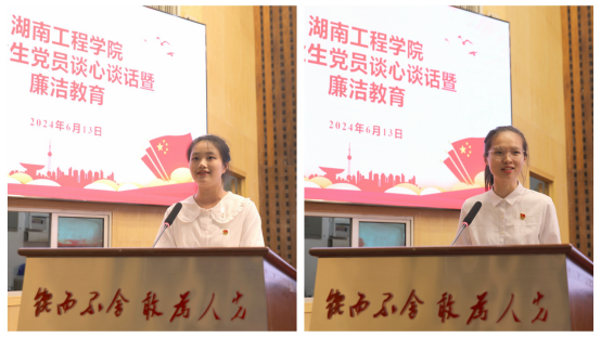 电气与信息工程学院毕业生党员周芸瑛、管理学院毕业生党员甘颖作分享发言。周芸瑛表示,将牢记使命,敢于担当,全身心投入电子信息的科研中,在服务党和人民伟大事业中实现个人价值。甘颖表示,将铭记党员身份,不忘入党初心,志愿到基层工作,勤奋敬业,乐于奉献,继续用自身的专业知识转化为响应乡村振兴的实际行动。毕业生党员代表们的精彩分享,展现出这一代湖工学子投身于强国伟业中的青春风采。