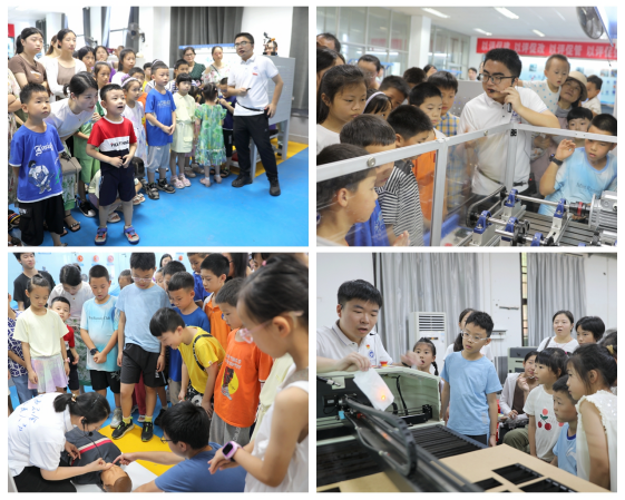 本次活动包含数字化、智能化技术知识科普与科技制作体验两个环节。参与活动的教职工和孩子们一起,沿着科普线路,依次参观了智能科学与工程学院的智能制造实训室、现代钳工实训室和工程实践文化园。孩子们亲眼见证了机械手是如何将不同的饮料罐抓取后,精准地将罐中饮料倒入杯中;看到了机械传动机构是如何实现运转的,还学习了触电后该如何施救等科学知识。孩子们饶有兴趣地追问着老师和大学生哥哥们,科学的种子已然在他们幼小的心灵中悄悄萌芽……