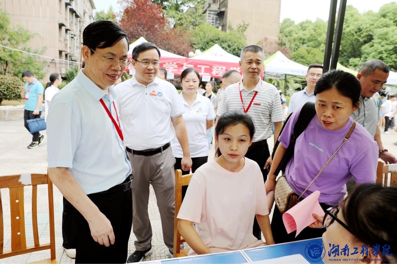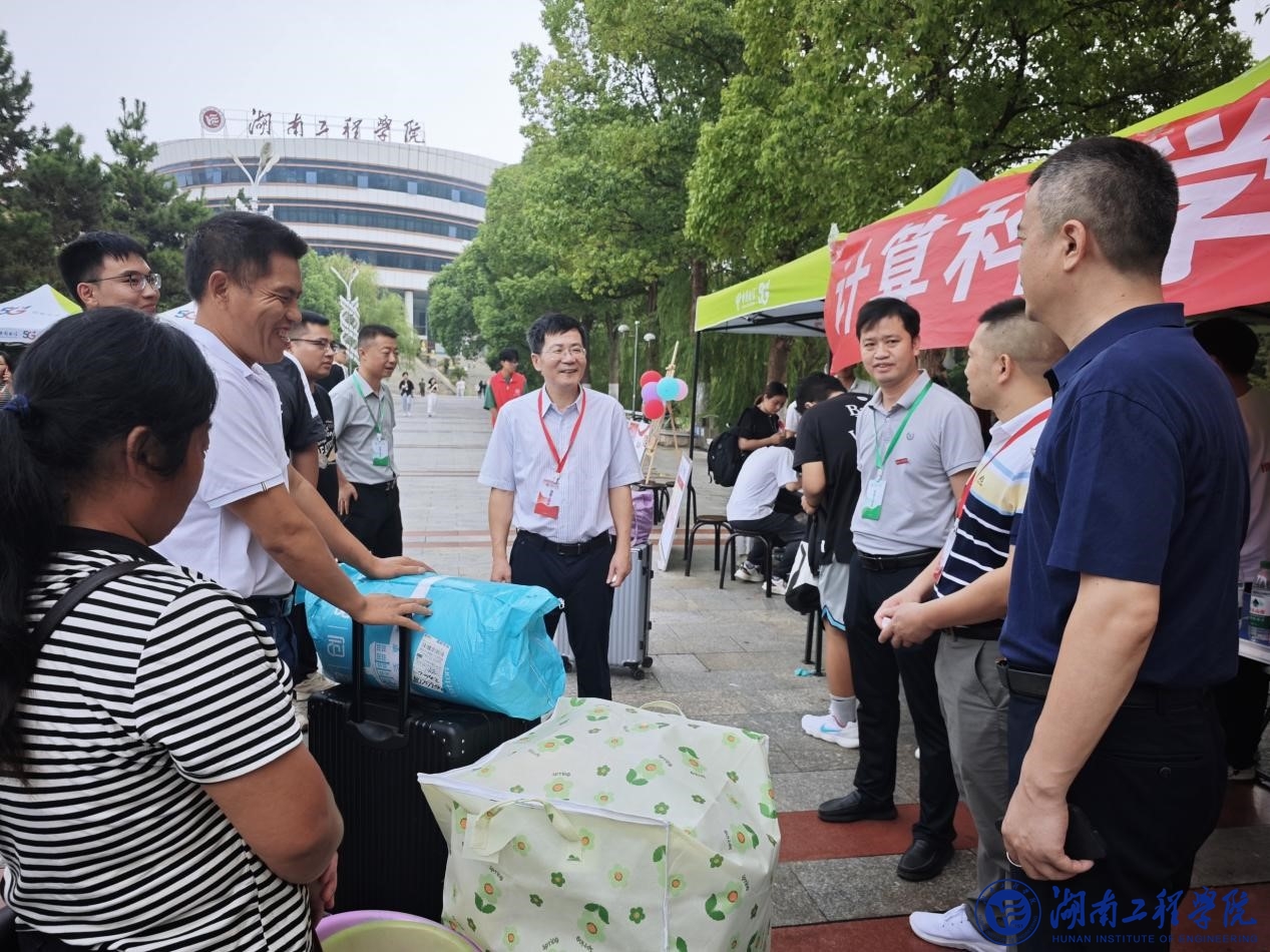 黄昕和新生及新生家长亲切交谈,对新生的到来表示热烈欢迎,细心询问报到的相关情况,热情解答了新生和家长的问题,鼓励新生一定要好好学习,爱国爱校,尊敬师长,孝敬父母。并请家长们放心交小孩交给学校,湖工全体教职工永远是学生的坚强后盾。