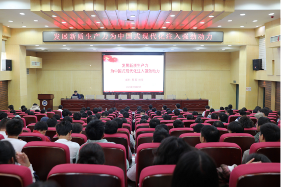 易兵围绕深刻把握新质生产力的时代内涵、充分认识发展新质生产力的重大意义、在发展新质生产力的征程中作出新贡献三个方面进行讲授。易兵从新质生产力的提出、理论内涵、基本特征、与传统生产力的区别与联系,引入“新质生产力”这一概念。结合国家战略发展需求,易兵指出,新质生产力是应对新一轮科技革命和产业变革的必然选择,是高质量发展的物质基础,是实现中国式现代化的根本动力。最后,易兵从“打造三张名片,凝练特色优势”为同学们重点讲述了我校以实际行动积极响应国家新质生产力发展需求以及取得的成果。