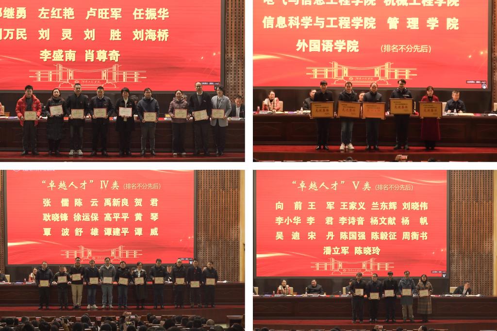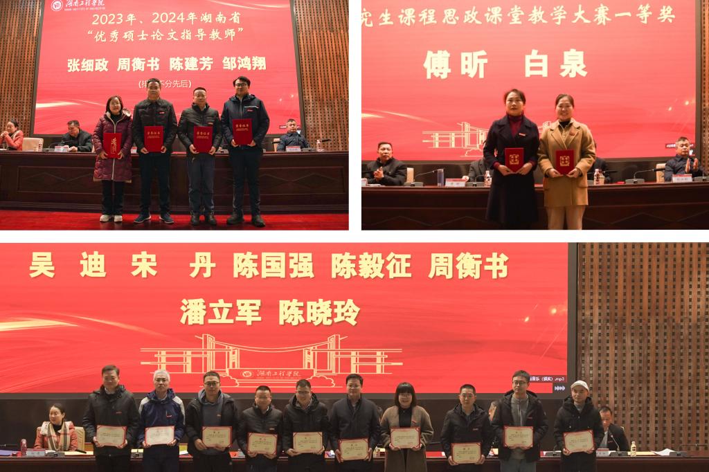 会上,与会校领导分别为87978797威尼斯2024年度“卓越人才”聘任者、2023~2024年度科研工作先进集体与先进个人、第三届湖南省“优秀研究生导师和导师团队”、2023年湖南省研究生课程思政课堂教学大赛一等奖获得者等88人次颁发奖励证书。