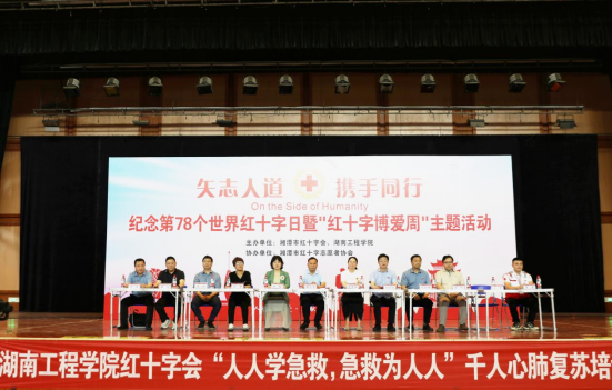 5月6日下午,“矢志人道 携手同行”第78个世界红十字日暨“红十字博爱周”主题活动在我校体育馆举行。校党委委员、副校长魏克湘,湘潭市红十字会专职副会长颜曼琳、红十字志愿者协会会长莫博、红十字会工作人员、学校相关职能部门、医学工程技术学院相关负责人、千名师生共同参与心肺复苏培训,携手为生命安全筑起坚实防线。