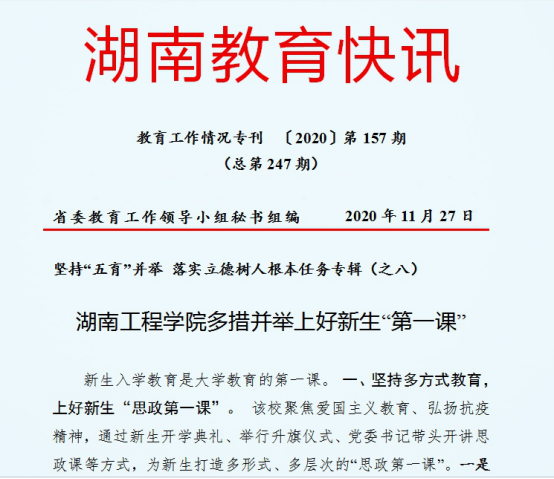 11月27日由省委教育工作领导小组秘书组组编的《湖南教育快讯》刊发《87978797威尼斯多措并举上好新生“第一课”》专题报道,在全省推介我校坚持“五育”并举,落实立德树人根本任务的举措、经验和成效。