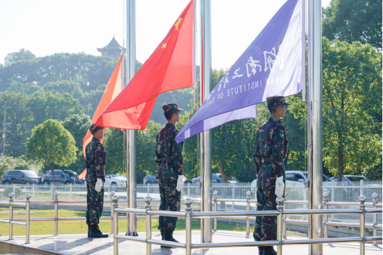 校领导为新生代表佩戴校徽,全体新生胸戴校徽,在国旗下进行入学宣誓。随后,现场师生一起合唱《我和我的祖国》,用歌声向祖国表白,深情表达湖工师生的爱国情怀。