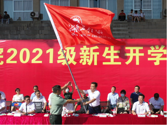 新生开学典礼后举行2021级本部新生军训动员大会。党委书记陈岳堂为军训团授旗。