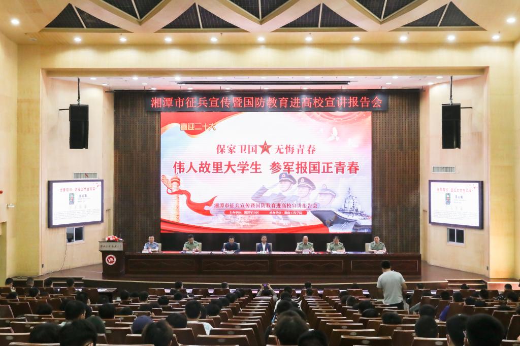 5月23日下午,湘潭市2022年征兵宣传暨国防教育进高校宣讲报告会在我校一报告厅举行。湘潭市市委常委、常务副市长、市征兵工作领导小组组长吴志雄,我校党委委员、副校长、校征兵工作领导小组副组长张小刚,军分区动员处上校处长、市人民政府征兵办公室主任龚政军,雨湖区人武部上校部长曾力真,岳塘区人武部上校、政治委员胡轶飞,学校人民武装部全体成员及各二级学院副书记在主会场参会。会议由湘潭军分区大校、政治委员黄献国主持。
