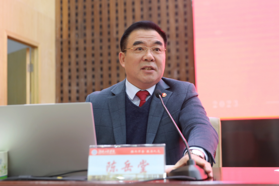 奋进新征程,展现新担当。为深入学习贯彻习近平新时代中国特色社会主义思想和党的二十大精神,引导广大党员干部、全体师生坚定信念、同心同德、埋头苦干、奋勇前进,推动学校各项工作高质量发展,2月16日上午,我校学习贯彻党的二十大精神研讨班在一报告厅开班。原党委书记陈岳堂教授主讲第一课,党委副书记、校长易兵主持。在校校领导、党委委员、中层以上干部,教研室主任、副主任,科级干部、岗位负责人、专职组织员参加。