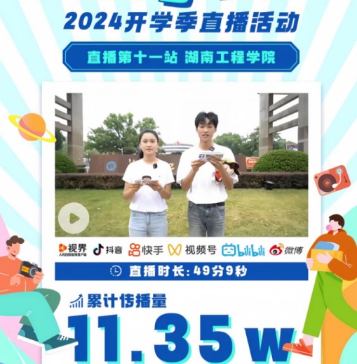 “又是一年开学时,团团带你逛校园~屏幕前的团子们,大家好,我们是‘爱你所爱,想你所想,说你想说’的湖南团团......”9月12日,由共青团湖南省委、湖南省学生联合会指导,共青团湖南省委宣传部主办的“你好,大学生”2024年开学季直播活动第十一站在我校顺利进行。该活动在人民日报视频客户端、“青年湖南”视频号、“湖南共青团”B站、微博、抖音、快手、“我的飞Young校园”视频号等7个平台同步播出。我校计算科学与电子学院统计学专业学生张孜慧、纺织服装学院服装表演专业学生楚旭辉两位校园主播带领6000余名新生和近12万名观众一起“云”游湖工校园。