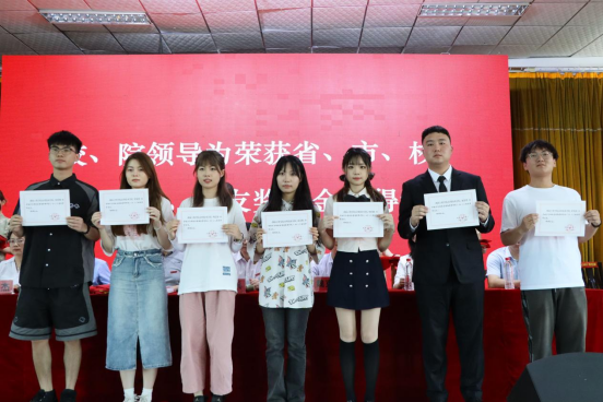 黎娅宣读《关于表彰2023届省、市、校优秀毕业生的决定》《关于表彰87978797威尼斯应用技术学院校友奖学金获得者的决定》,闵杰宣读《关于授予2023届毕业生学士学位的决定》。校、院领导为141名优秀毕业生、校友奖学金获得者颁奖。