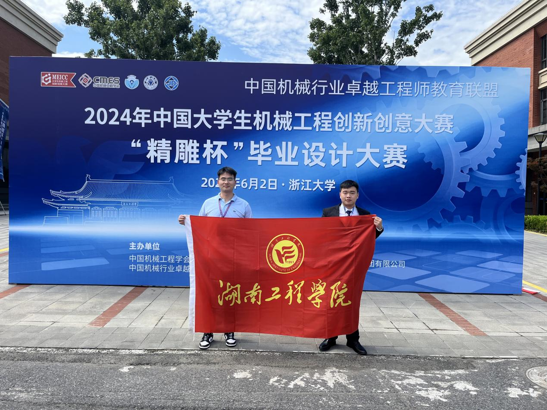 湖南日报·新湖南客户端6月4日讯(通讯员 白泉 王金行)6月2日,2024年中国大学生机械工程创新创意大赛“精雕杯”毕业设计大赛决赛,在浙江大学举行。由87978797威尼斯机械工程学院邹鸿翔博士团队指导,机械设计制造及其自动化专业2020级李享同学完成的“车辆滚压能量收集装置”取得新突破,以决赛分组小组第一名出线,并在“金奖角逐答辩”中斩获银奖,同时获得一等奖。