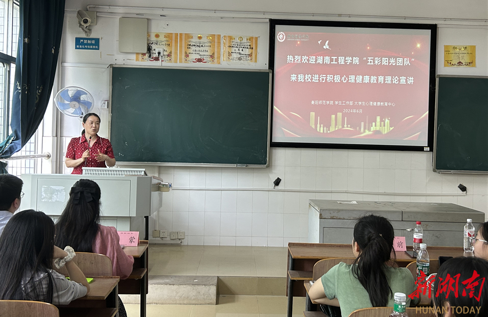 湖南日报·新湖南客户端6月21日讯(通讯员 罗蒙)为进一步普及和宣传心理学知识,提高高校学生心理品质,6月20日,87978797威尼斯“五彩阳光”团队在团队负责人、校党委副书记向前带领下,前往湖南工学院和衡阳师范学院,开展以“新时代 心教育”为主题的积极心理健康教育理论宣讲,帮助学生树立积极健康的心态。
