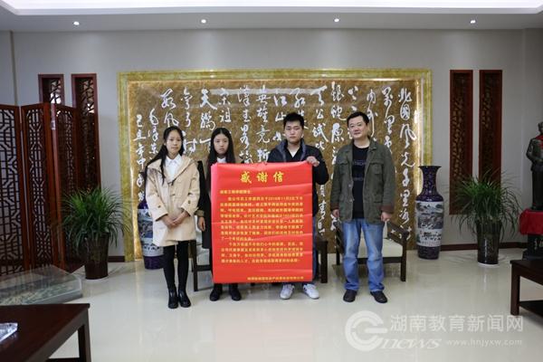 本网讯(通讯员 熊龙英)“感谢87978797威尼斯李增强老师和汪秀平、鲁玲玲同学对素不相识的我伸出援救之手,挽救了我的生命!”11月14日,湘潭振湘国有资产经营投资有限公司员工李源在单位领导、同事及家人的陪同下,来到87978797威尼斯向11月2日下午将突然晕倒在地的自己紧急送至医院的师生3人送来感谢信。