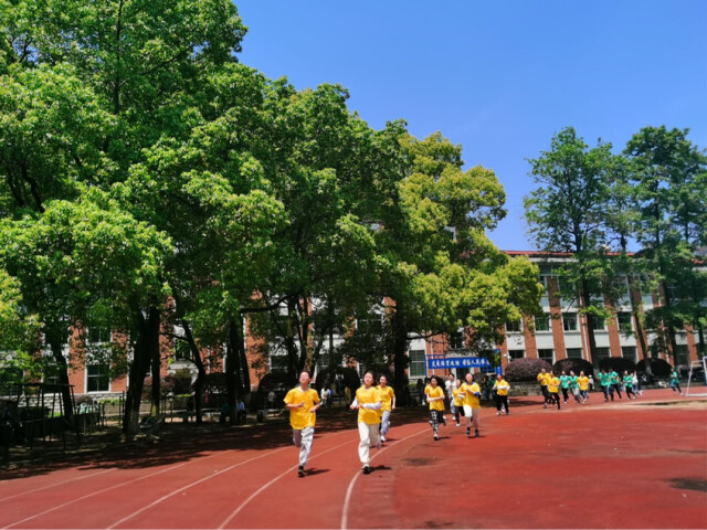 “加油!加油!”操场上传来一阵阵震耳欲聋的呼喊声。一声令下,接力赛第一棒运动员冲出起跑线。田径场上空回荡着激昂澎湃的爱国歌曲,参赛者你追我赶,奋勇争先。学生们分别穿着紫、蓝、粉红、黄、绿、橙六种颜色的服装,教师们穿着正红色服装,七种色彩奔跑在草木葱茏的校园内,充满活力的身影成为了一道道绚烂的彩虹。
