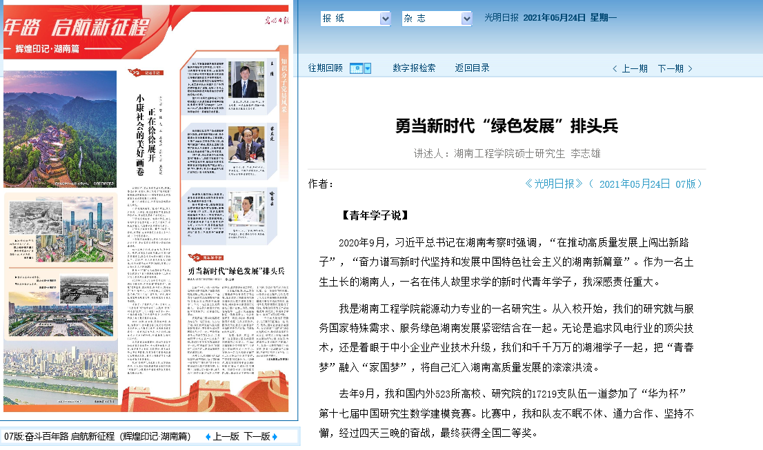 一个人的力量也许很微小,但只要我们汇集在一起,发光、发热,国家就会越来越强大。站在湖南“三高四新”战略的起跑线上,我们以奔涌不息的姿态,感受这片土地上蕴含的奋勇前行的力量,为祖国、为湖南的发展贡献自己绵薄之力。这是一名普通的研究生的梦想,更是一名湖湘学子与祖国、与湖南这片热土同呼吸、共命运的责任与担当。(本报记者龙军整理)